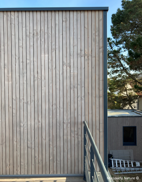 Ils souhaitent une maison à volumétrie simple, inspirée de notre Collection Printemps, Création 3. Comme pour ce modèle d’inspiration, ils choisissent d’habiller intégralement leur nouvelle maison d’un bardage bois vertical à faux claire-voie en douglas français prépatiné gris.