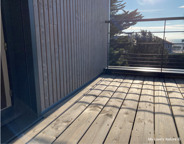 La terrasse est taillée dans le volume. D’une surface de 10 m², orientée sud-ouest, elle surplombe l’habitat avoisinant et offre une belle vue sur la mer. Elle est réalisée dans la même essence de bois que le bardage, en douglas français PEFC. Le garde-corps métallique assure sa fonction sans entraver la vue. La chambre ouvre par une large baie vitrée sur cet espace extérieur. Le bureau mezzanine dispose lui aussi d’un accès direct vers la terrasse.